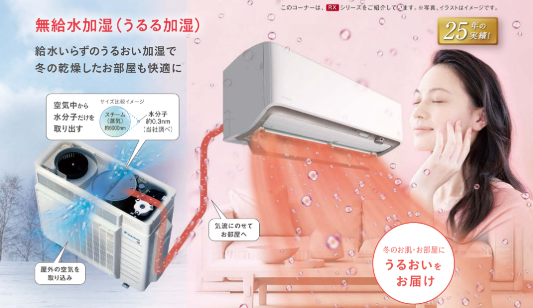 さらに、うるさらの名前の由来である無給水加湿機能を搭載しており、給気と排気、両方の換気を行うことができるエアコンです。